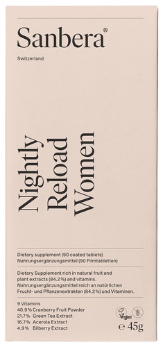 Nightly Reload Women is our unique formula and the second phase of the Sanbera System that can help optimize health while you rest. This harmonious fusion of science and nature blends premium ingredients to create a formula that contributes to restoring the body with potent extracts from Cranberry, Green Tea, Acerola, and Bilberry alongside nine essential vitamins. Each revitalizing ingredient is hand picked to provide your body with the nutrients known to boost your natural defenses in combination with a healthy lifestyle and diet.